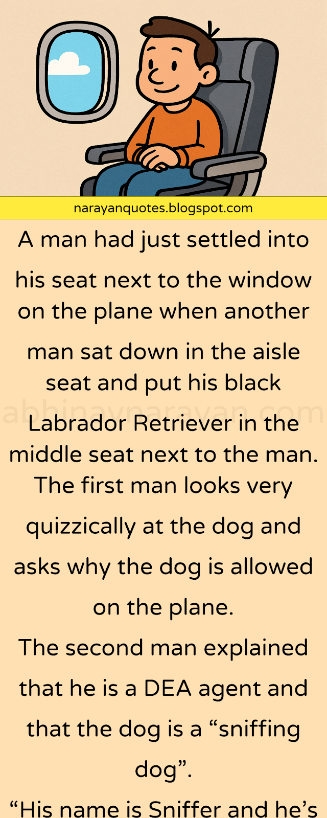 A man had just settled into his seat next to the window on the plane when another man sat down in the aisle seat and put his black Labrador Retriever in the middle seat next to the man.